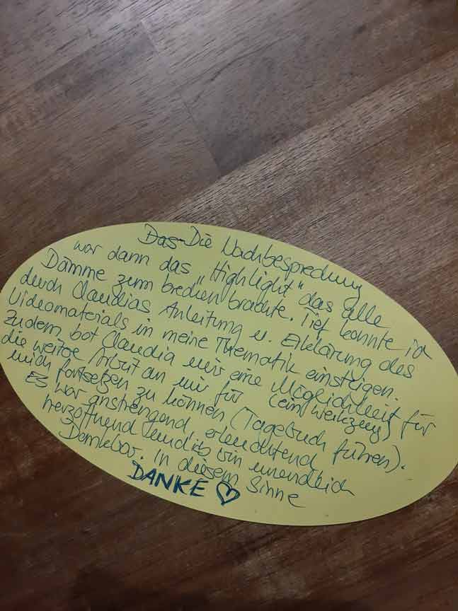 Dabei war der Tag sehr abwechslungsreich und kurzweilig und es gab viel Gelegenheit über mich selbst zu lachen. Man spürt einfach, dass ihr für das Thema brennt und ihr mit ganzem Herzen dabei seid. Es war eine außergewöhnliche Erfahrung.